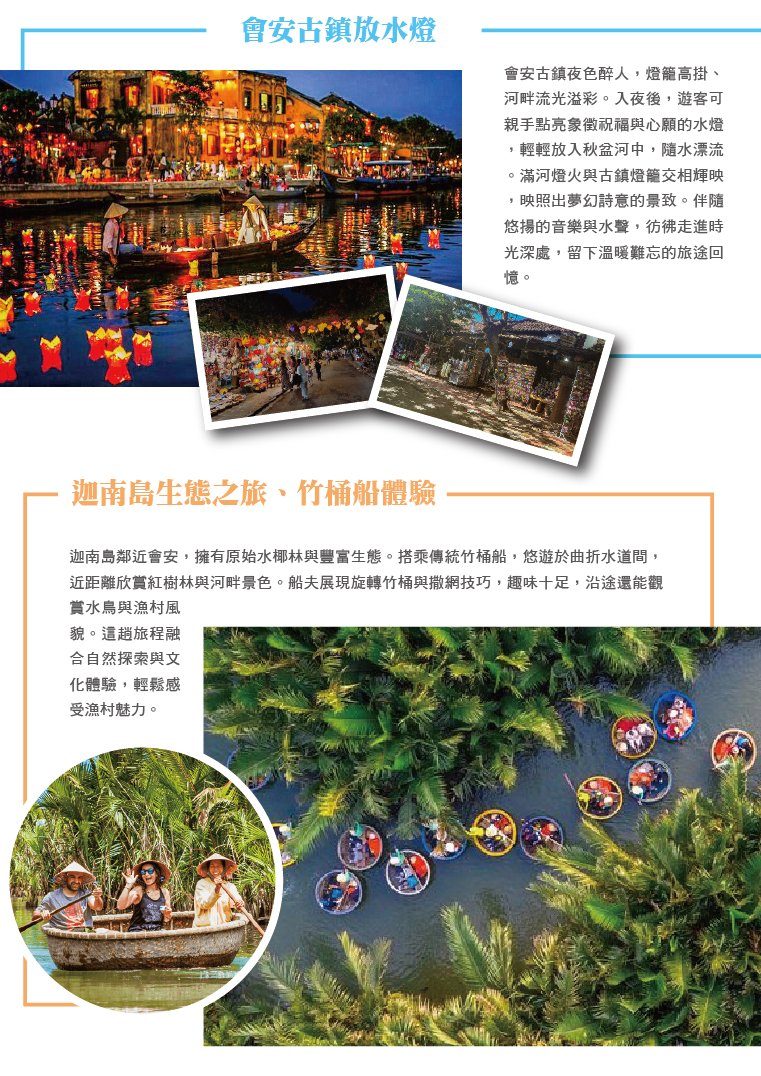 會安-迦南島生態之旅、竹桶船體驗→會安→體驗手作燈籠→古城下午茶-會安古城(福建會館、日本橋、廣肇會館、進記古宅)-夜遊會安古鎮+放水燈