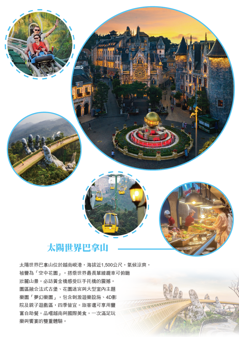 峴港-巴拿山~搭乘世界最長纜車來回→法國山城→熱門打卡點:黃金橋天空步道、空中花園、靜心園→Fantasy Park夢想樂園