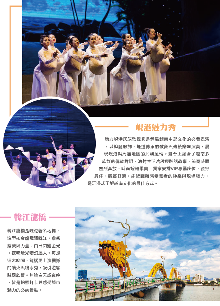 【魅力峴港民族歌舞秀(獨家VIP座)峴港最具代表的大型民族風情歌舞秀,深度挖掘峴港旅遊文化,並斥鉅資邀請眾多著名舞蹈藝術家參與編排製作,經由不同舞蹈形式充分展現越南人文風俗民情、歌唱傳頌越南人民的勤勞善良,展現友好與和諧。