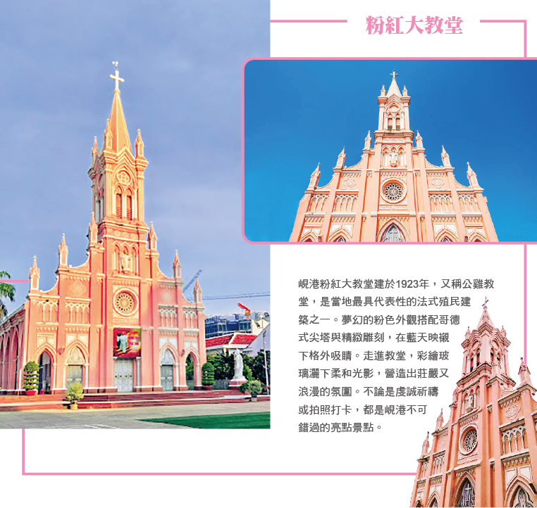 【粉紅大教堂】法國殖民時期歌德式建築的天主教堂,建於1923年,整座教堂的外牆以粉紅色為主,為越南中部最大的西方教堂,是法國殖民時期的建築作品,因塔頂上有個 公雞的風向標誌,當地人又稱公雞教堂。在藍天白雲之下,陽光撒落在粉紅教堂上如糖果般的繽紛。